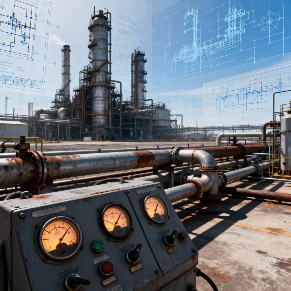 Create a high-quality image of a modern oil and gas facility with pipelines, refinery towers, and industrial engineers reviewing blueprints. Emphasize precision, safety, and technology. Use natural lighting with a professional, realistic tone.