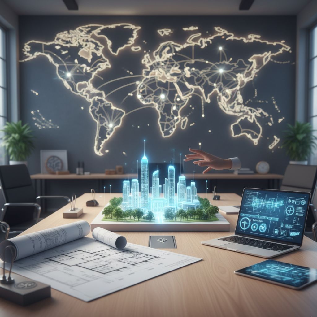 Generate an image showing a high-level meeting or boardroom with global project maps, digital dashboards, and executives discussing long-term operational strategies.